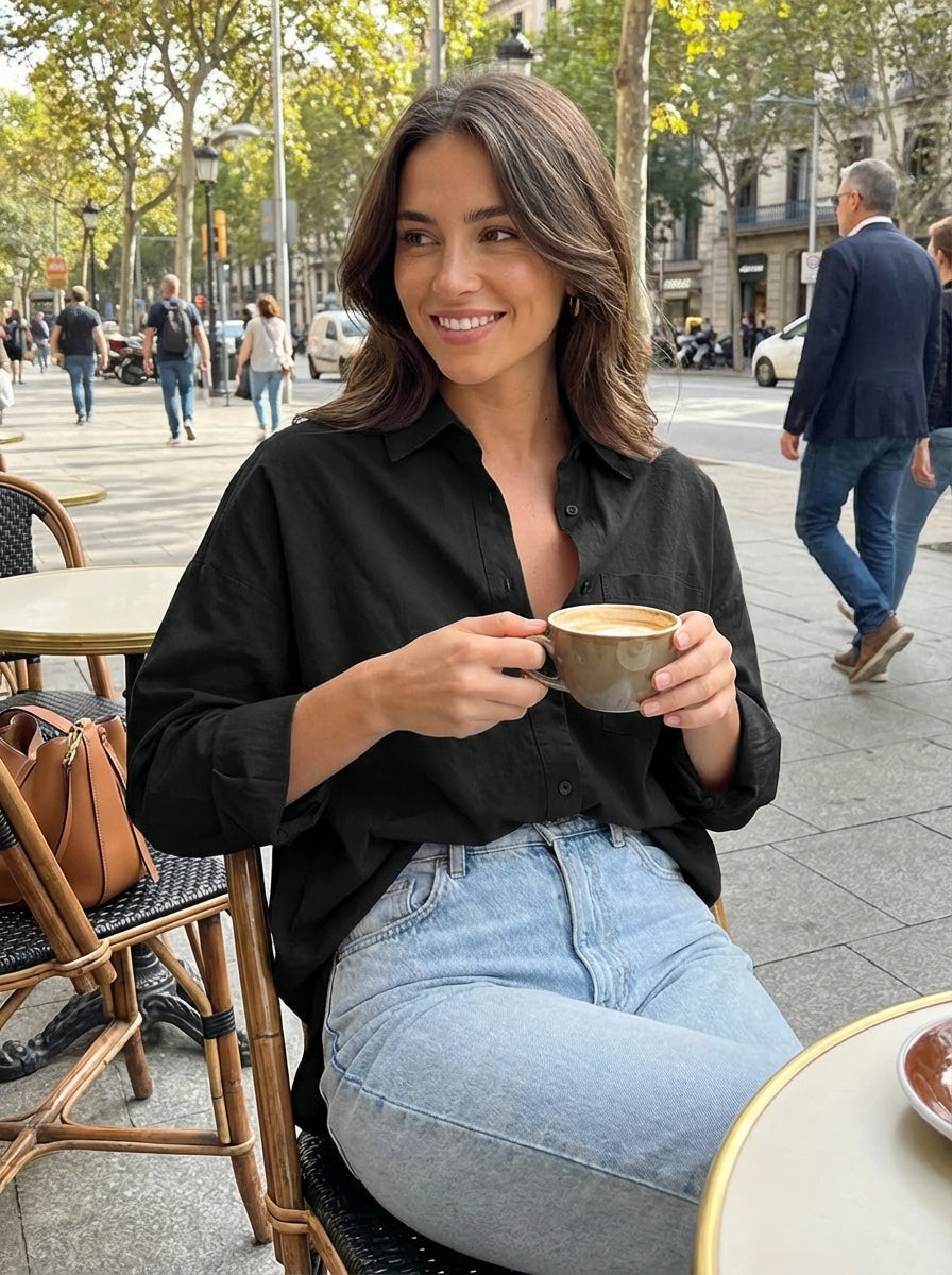 This women's long sleeve shirt blouse features a classic collar and a button-up front for a clean and structured look. The longer silhouette creates a balanced outline that pairs easily with different outfits and everyday styling. Suitable for daily wear, office looks, or a more put-together daytime appearance.